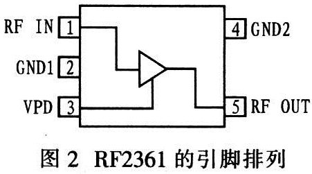圖2為RF2361的引腳排列,其中:RF IN為低噪聲功率放大器輸入,需通過一阻抗匹配網(wǎng)絡達到50Ω阻抗匹配:RF0UT為低噪聲功率放大器輸出,也需通過一阻抗匹配網(wǎng)絡達到50Ω阻抗匹配;同時電源VCC給整個電路提供工作電壓。VPD用于控制偏置電流,與偏置電阻R1共同確定偏置電流。GND1、GND2為接地。