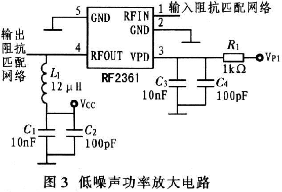 以低噪聲功率放大器RF2361為核心設計的低噪聲功率放大電路,如圖3所示,其VPD引腳上的并聯(lián)電容器實現(xiàn)電源VPD的濾波,RFOUT引腳上的電感電容串并聯(lián)網(wǎng)絡可對電源VCC濾波?! ?/p>