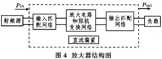 典型的放大器一般包括輸入匹配網(wǎng)絡、晶體管放大電路、阻抗變換網(wǎng)絡、直流偏置和輸出阻抗匹配網(wǎng)絡,如圖4所示。確定阻抗匹配網(wǎng)絡中元件的參數(shù)、類型以及連接關系是實現(xiàn)匹配網(wǎng)絡的關鍵。阻抗匹配是射頻電路設計的重要問題,其目的是為了實現(xiàn)能量的最大功率傳輸,提高能量的傳輸效率?! ?/p>