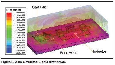 第二個關(guān)注的地方是微帶線附近的場線,在靠近地平面的地方它們最強。只要屏蔽和地平面間的距離明顯大于微帶線和地平面間的距離,則增加的屏蔽的效用就微乎其微。線綁定和表貼電感與地平面的直接耦合要弱些,當(dāng)施加屏蔽時,預(yù)期其場線會有變化。圖3顯示的是3D模擬的E場分布。