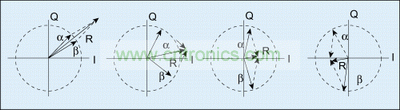 圖1用矢量圖顯示了兩個(gè)電壓恒定、相位不同的信號(hào)α與β如何合并起來(lái)形成一個(gè)任意電壓信號(hào)R,圖2是采用異相技術(shù)的功率放大器結(jié)構(gòu)示意。