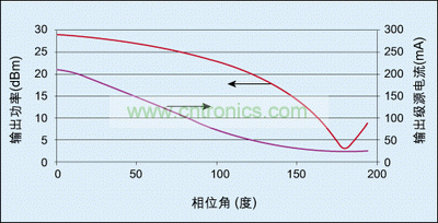 圖3顯示了輸出功率和輸出級(jí)源電流與放大器驅(qū)動(dòng)信號(hào)相位角之間的關(guān)系,該圖數(shù)據(jù)得自于一個(gè)運(yùn)行在5.25GHz、Vdd為5V的放大器。請(qǐng)記住,放大器已進(jìn)入深度飽和,因而工作在恒定的電壓振幅下,但要注意源電流與異相角有很大的關(guān)系。這說(shuō)明每個(gè)放大器的阻抗(往合并器方向看)在低輸出功率時(shí)確實(shí)增大,而源電流在下降。