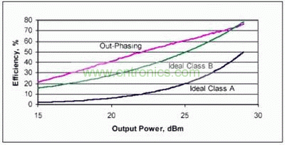 運(yùn)行于峰值功率時(shí),傳統(tǒng)AB類放大器效率很高(理論效率為78.5%),而在低功率下,其效率下降非常迅速。當(dāng)此類放大器用于802.11a OFDM信號(hào)時(shí),必須調(diào)整放大器以處理峰值功率水平,但平均運(yùn)行于比峰值低8dB的水平上,因此大多數(shù)時(shí)間都運(yùn)行在極低的效率下,平均效率只有10%左右,如果放大器退一步支持54Mbps數(shù)據(jù)率效率將更低。
