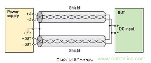 在使用屏蔽電纜時(shí),要確保將屏蔽的一端接地。如圖所示,屏蔽的一端與電源的地接在一起,否則會(huì)增加接地電容。