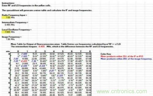 圖2. 樣本混頻器表,顯示在混頻過程中產(chǎn)生的多種nf1 ± mf2產(chǎn)物,其中f1和f2分別是混頻器的RF輸入和本振輸入頻率。