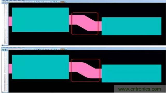 設(shè)計(jì)用于射頻和微波的銅皮形狀時(shí),一個(gè)很重要的方面是能夠創(chuàng)建帶尖拐角的Gerber 文件。優(yōu)秀的PCB設(shè)計(jì)工具可以簡(jiǎn)化這一過(guò)程。例如,使用50 毫米線條繪制形狀與使用50 毫米圓形光圈繪圖相比,往往令設(shè)計(jì)具有較小的半徑。設(shè)計(jì)工具在創(chuàng)建Gerber 文件時(shí),可通過(guò)正確地自動(dòng)轉(zhuǎn)換線條寬度來(lái)獲得尖拐角(圖2)。