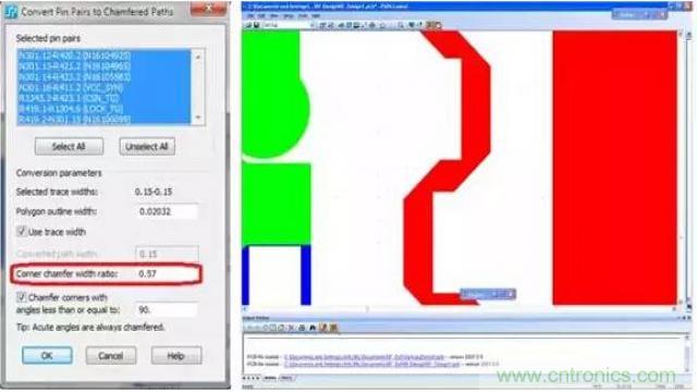 射頻和微波電路中經(jīng)常用到倒角,以減小饋線與電容器之間的分段不連續(xù)性電抗,從而改善MMIC 的頻率性能。90º 拐角與倒角之間的距離至關(guān)重要。因此,設(shè)計(jì)人員需要采用自動(dòng)方法來(lái)基于設(shè)計(jì)指定需要生成的倒角比率。PCB 設(shè)計(jì)工具如果能夠基于設(shè)計(jì)規(guī)則自動(dòng)強(qiáng)制實(shí)施需要生成的倒角比率,設(shè)計(jì)人員和工程師將會(huì)從中受益,在節(jié)省時(shí)間的同時(shí)提高設(shè)計(jì)質(zhì)量(圖3)。