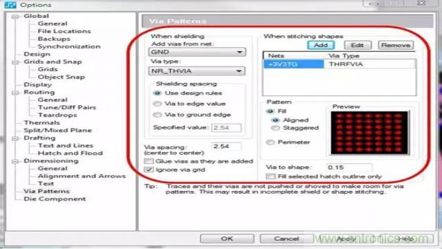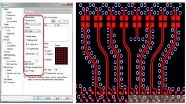射頻設(shè)計(jì)的另一個(gè)重要方面是確保正確地屏蔽帶過(guò)孔的區(qū)域。盡管此任務(wù)可由設(shè)計(jì)人員手動(dòng)進(jìn)行,但這個(gè)過(guò)程極其耗時(shí)。如果PCB 設(shè)計(jì)工具能夠自動(dòng)完成此過(guò)程,將可以縮短設(shè)計(jì)周期時(shí)間并確保符合您的所有設(shè)計(jì)規(guī)則。利用此類工具,設(shè)計(jì)人員可以指定過(guò)孔模式生成規(guī)則,而將剩余的工作全部交由PCB 設(shè)計(jì)工具完成。