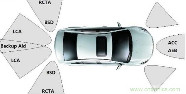 應(yīng)用于汽車的防撞雷達(dá)一般工作在兩個頻段:24GHz-24.25GHz和76GHz-81GHz;工作在24GHz頻段的防撞雷達(dá)一般安裝在汽車后向,實(shí)現(xiàn)盲區(qū)監(jiān)測(BSD),變道輔助(LCA)以及倒車側(cè)向警告(RCTA)等功能;工作在76GHz-81GHz頻段的毫米波防撞雷達(dá)一般安裝在汽車前向,用于實(shí)現(xiàn)自適應(yīng)巡航(ACC),緊急制動(AEB)等功能。汽車防撞雷達(dá)不同功能覆蓋區(qū)域如圖1所示: