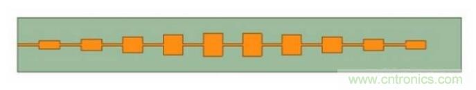 在串饋微帶貼片陣列中,每個貼片天線的寬度正比于貼片天線等效導(dǎo)納,而等效導(dǎo)納又正比于該貼片的激勵功率;因此通過并調(diào)節(jié)線陣中每個貼片的寬度,可以改變該天線的激勵功率,從而實(shí)現(xiàn)線陣激勵的錐削分布,滿足防撞雷達(dá)天線在俯仰面對于低副瓣的要求。