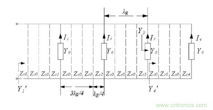 該串饋網(wǎng)絡(luò)依靠阻抗變換段實(shí)現(xiàn)波束賦形的激勵幅度,通過改變輸出饋線的長度實(shí)現(xiàn)波束賦形的激勵相位;串饋網(wǎng)絡(luò)等效電路如圖9所示