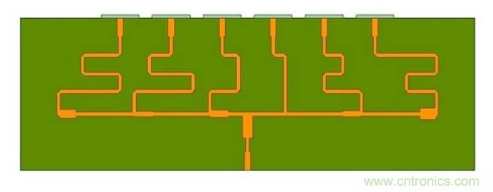 3.2節(jié)確定了各線陣激勵的幅相值,但圖8里的仿真方向圖是理想的,現(xiàn)實(shí)中需要通過1分6的功分網(wǎng)絡(luò)來將其實(shí)現(xiàn)。常用的功分器有Wilkinson功分器和T型節(jié)功分器;Wilkinson功分器只能組成并饋網(wǎng)絡(luò),這種網(wǎng)絡(luò)具有較大的損耗且占用面積大,不利于小型化;而由T型節(jié)組成的串饋功分網(wǎng)絡(luò)具有損耗低占用面積小的優(yōu)勢,更適合于實(shí)現(xiàn)3.2節(jié)中波束賦形的幅相激勵。