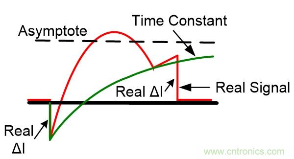圖6顯示了如果在目標電路同一位置的電流檢測電阻上查看,實際信號是如何按預(yù)期出現(xiàn)的。盡管內(nèi)心里想以任何精度從顯示信號中減去時間常數(shù),但這在數(shù)學(xué)上不切實際。因此,關(guān)于顯示可信度的陳述與電流轉(zhuǎn)換相去甚遠。當然,也可以花大價錢買一個磁性“DC”電流探頭幫你做上述數(shù)學(xué)計算,但是帶寬太低。
