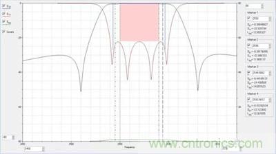 3.1 多模濾波器的設(shè)計,通帶電性能的評估,和單模的評估是一樣的,只是在Q值的評估中,多模的Q值是要高于單模的,這個可以根據(jù)本征模的仿真中觀察到。下圖為一個雙腔4模濾波器的原理評估仿真結(jié)果: