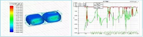通過以上電場分布圖可以觀察到,單腔雙模,單腔三??梢宰杂蛇x擇。在高次模出現(xiàn)的頻率點上,通過選擇介電常數(shù),與控制諧振腔尺寸,對高次模進(jìn)行優(yōu)化。盡量拉遠(yuǎn)高次模出現(xiàn)的頻率,減小對通帶的影響。