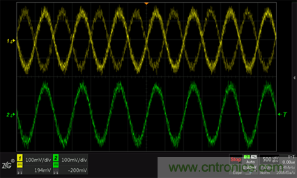 圖5 CH1不開啟高頻抑制觸發(fā)不穩(wěn)、CH2開啟高頻抑制