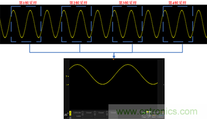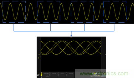 示波器的觸發(fā)條件的一個(gè)很關(guān)鍵的因素是觸發(fā)電平,觸發(fā)電平大多數(shù)情況下是用一根直流電平作為基準(zhǔn),當(dāng)信號(hào)的電壓超過該直流電平的時(shí)刻作為采樣波形的起始點(diǎn)。由于起始采樣的位置是有規(guī)律的,因此多次采樣的波形進(jìn)行疊加后看上去還是一個(gè)穩(wěn)定的波形。如圖3所示: