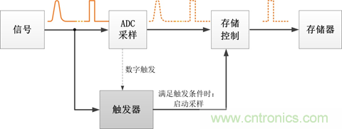 這就要靠觸發(fā)系統(tǒng)來實(shí)現(xiàn)。觸發(fā)的原理是一直監(jiān)控信號(hào)流,若發(fā)現(xiàn)信號(hào)滿足設(shè)定的觸發(fā)條件,觸發(fā)器記錄滿足條件的信號(hào),啟動(dòng)采樣;待數(shù)據(jù)采集完畢后,由控制器對(duì)信號(hào)進(jìn)行處理和顯示。具體如圖2所示。