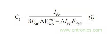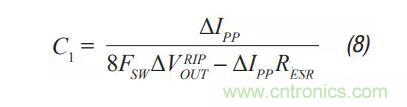 第1步:正如之前的拓?fù)?,選擇C1,使其等于沒有輸出濾波器時(shí)的情況。10 mV p-p至100 mV p-p是個(gè)不錯(cuò)的開始,具體取決于最終目標(biāo)輸出紋波。C1隨后可通過公式8計(jì)算得出。C1在這個(gè)拓?fù)渲锌梢圆捎帽戎巴負(fù)涓〉臄?shù)值,因?yàn)闉V波器效率更高。