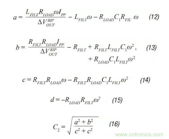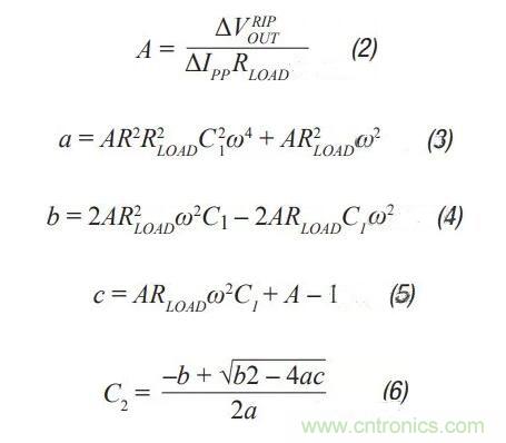 第3步:C2隨后可通過公式2至公式6計(jì)算得出。A、a、b和c是簡化計(jì)算的中間值,沒有實(shí)際意義。這些公式假定R < />LOAD,且每個(gè)電容的ESR較小。這些都是很好的假設(shè),引入的誤差很小。C2應(yīng)等于或大于C1??烧{(diào)節(jié)第1步中的紋波,使其成為可能。