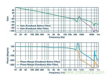 反饋在濾波器電感之前或之后獲取。人們沒有想到的是,哪怕濾波器不在反饋環(huán)路內(nèi)部,開環(huán)波特圖依然存在非常大的變化。由于控制環(huán)路無論濾波器是否在反饋環(huán)路中都會(huì)受影響,因此也應(yīng)對(duì)其進(jìn)行適當(dāng)補(bǔ)償。一般而言,這意味著將目標(biāo)交越頻率向下調(diào)整至不超過濾波器諧振頻率(FRES)的五分之一到十分之一。