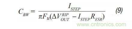 第3步:如前所述,添加濾波器會(huì)影響轉(zhuǎn)換器補(bǔ)償,具體表現(xiàn)為降低可實(shí)現(xiàn)的交越頻率(Fu)。根據(jù)公式7的計(jì)算,對(duì)于電流模式轉(zhuǎn)換而言,可實(shí)現(xiàn)的最大Fu是開關(guān)頻率的1/10以下,或者是濾波器FRES的1/5以下。幸運(yùn)的是,大部分模擬負(fù)載不需要太高的瞬態(tài)響應(yīng)。公式9計(jì)算轉(zhuǎn)換器輸出所需的輸出電容近似值(CBW),以提供指定的瞬態(tài)電流階躍。
