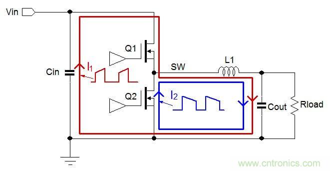 當(dāng)上橋MOSFET Q1導(dǎo)通的時候,電流從電源流出,經(jīng)Q1和L1后進入輸出電容和負(fù)載,再經(jīng)地線回流至電源輸入端。在此過程中,電流中的交變成分會流過輸入電容和輸出電容。這里所說的電流路徑如圖2中的紅線所示,它被標(biāo)注為I1。