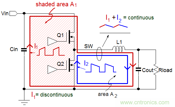 在上面所述的回路中,電流環(huán)I1和I2共同共享了自開關(guān)節(jié)點→電感→輸出電容→地→Q2的源極這一段路徑。I1和I2合成起來后就形成了一個相對平緩、連續(xù)的鋸齒狀波形,由于其中不存在電流變化率dI/dt極高的邊沿,其包含的高頻成分就要少一些。
