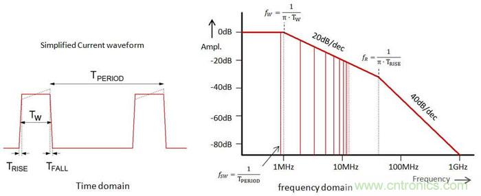 為了理解這能導(dǎo)致多大程度的改進,我們需要對不連續(xù)電流脈沖的高頻成分進行一番探討。圖6左側(cè)顯示的是簡化為梯形了的電流波形,其周期為TPERIOD,脈沖寬度為TW,脈沖上升/下降時間為TRISE。從頻域來看此信號,其中含有基頻成分和很多高次諧波成分,通過傅里葉分析可以知道這些高頻成分的幅度和脈沖寬度、上升/下降時間之間的關(guān)系,這種關(guān)系被表現(xiàn)在圖6的右側(cè)。
