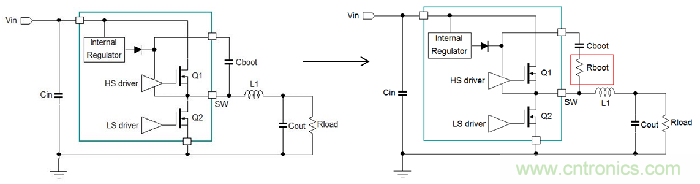 在MOSFET外置的設(shè)計中,電阻可被串接到上橋MOSFET的柵極上,這就可以同時增加上橋的導(dǎo)通時間和截止時間。