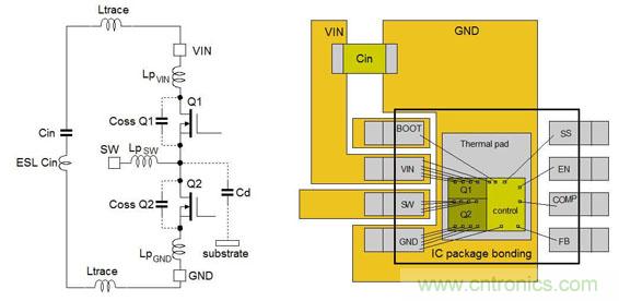 圖8顯示出了一個常規(guī)設(shè)計中的Buck轉(zhuǎn)換器IC中的寄生元件。
