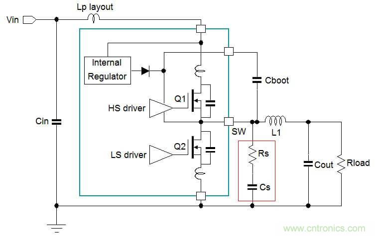 RC緩沖電路應(yīng)當(dāng)放置在緊靠開關(guān)節(jié)點和功率地處。在使用外部MOSFET開關(guān)的Buck轉(zhuǎn)換器中,RC緩沖電路應(yīng)當(dāng)直接跨過下橋MOSFET的漏極和源極放置。圖10示范了RC緩沖電路的放置位置。