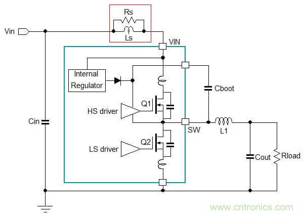 在理想狀況下,輸入、輸出電容對于Buck轉(zhuǎn)換器的開關(guān)電流來說都具有極低的阻抗。但在實際上,電容都存在ESR和ESL,它們都增加了電容的阻抗,并且導(dǎo)致上面出現(xiàn)額外的高頻電壓跌落。這種電壓跌落將在電源供應(yīng)線路上和負(fù)載連接電路上形成相應(yīng)的電流變化,見圖4。