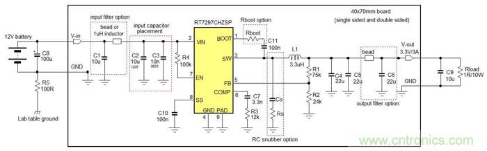 本章將示范在Buck轉(zhuǎn)換器的EMI設(shè)計中的不同方法所導(dǎo)致的影響。示范所使用的IC是RT7297CHZSP,一款800kHz工作頻率、3A輸出能力的電流模式Buck轉(zhuǎn)換器,采用PSOP-8封裝。測試中的電路工作在12V輸入下,輸出為3.3V/3A,測試所用電路顯示在圖12中。