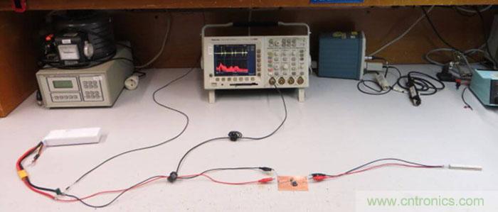 輸入線靠電池一側(cè)的接地端通過一只100Ω的電阻和實驗臺的地連接在一起,這就給整個電路提供了一個參考地,其阻抗很像EMC測試中的LISN網(wǎng)絡(luò)。