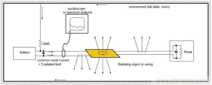 當(dāng)被測試對象被放在實驗桌上時,其PCB上的電流回路和導(dǎo)線就會向周圍環(huán)境輻射出高頻能量,這些輻射信號又會自己找到路徑返回到測試對象上,并以高頻共模電流的形式出現(xiàn)在供電線上。這些供電線上的高頻共模電流會和板上的電流結(jié)合在一起,可被用著輻射狀況的指示信號。
