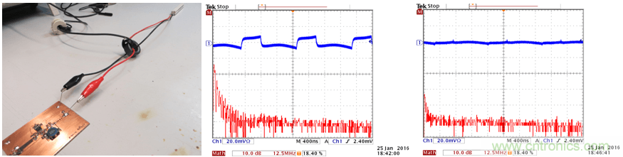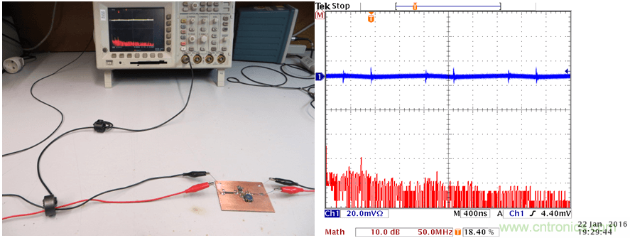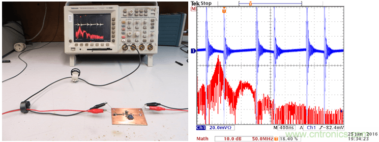 這種環(huán)形天線可以被連接到頻譜分析儀上,當(dāng)你使它在PCB上方移動時,你就可以看到哪里會有比較強的高頻磁場。你也可以把它連接到一臺示波器上(使用50Ω的端子),示波器上就可以顯示出相應(yīng)區(qū)域的切換噪聲水平。保持天線環(huán)和板子之間的相對位置和距離不變,對電路、PCB上的回路做出某些改變,你就可以知道噪聲水平在增加或是減少。