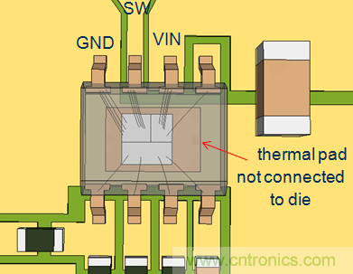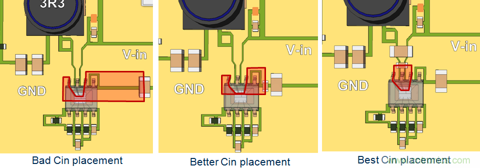 我們繼續(xù)使用單面PCB,并將CIN放置到靠近IC的地方,這樣就形成了比較小的CIN回路。參見圖20。