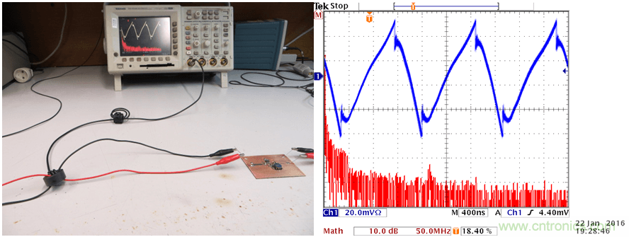 自制的EMI電流測試工具(見第8章)可被安置在電源輸入線和輸出線上。在本文中,我們是用示波器來觀看測量到的高頻電流信號,它能顯示出轉(zhuǎn)換器開關(guān)切換期間的高頻小信號。對于這種重復(fù)出現(xiàn)的開關(guān)切換信號而言,使用示波器的FFT功能進行計算并看到測量電流中的各種頻率成分是可能的。這種方法雖然不如頻譜分析儀那么精確,但仍然不失為一種非常實用的工具,可在簡單電路的分析中提供判斷依據(jù)。