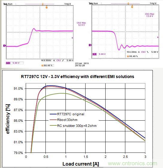 RC平滑抑制電路對效率的影響會比較大,特別是在輕載和中等負(fù)載的情況下,但最大也就1~2%,處于可以接受的范圍。需要特別注意的是,當(dāng)Buck轉(zhuǎn)換器的工作頻率很高和輸入電壓很高的時候,RC平滑抑制電路對效率的影響會很大。