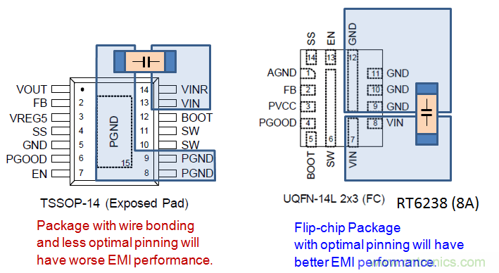 圖22顯示出了電容的放置方法,現(xiàn)在的CIN回路就通過IC的引腳、內(nèi)部的邦定線和0603規(guī)格的電容形成了。