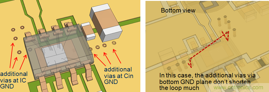 在上面的例子中,通到地線層的附加導(dǎo)通孔對縮減CIN回路的長度沒有幫助。但在另一個例子中,由于頂層的路徑很長,通過導(dǎo)通孔來縮小回路面積就十分有效。