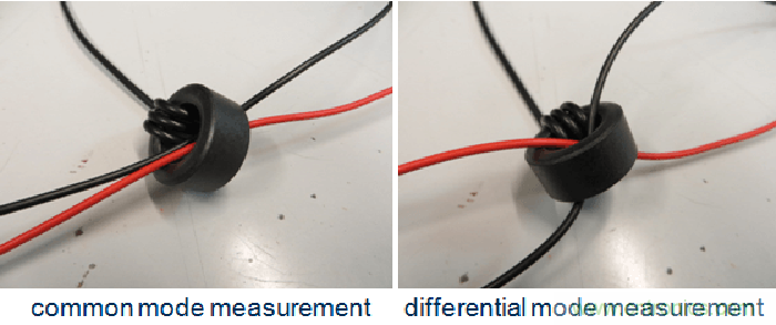 將電源線的正、負(fù)兩條線以同一個方向穿過鐵芯可測量其中的共模電流,顛倒其中一條線的方向則可測量差模電流。參見圖45。