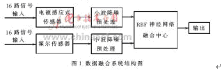 隨著電子技術(shù)、神經(jīng)網(wǎng)絡(luò)和人工智能處理技術(shù)的發(fā)展,國內(nèi)外都在開展新的漏磁信號處理方法的研究。由于傳統(tǒng)方法受人為因素影響嚴重,容易產(chǎn)生漏檢誤檢,大大影響了檢測準(zhǔn)確度,因此特別需要一種對缺陷信號的智能化處理方法。多傳感器數(shù)據(jù)融合技術(shù)是近年來形成和發(fā)展起來的一種自動化信息綜合處理技術(shù),它充分利用多源信息的互補性和計算機的高速運算能力來提高結(jié)果信息的質(zhì)量。由于多傳感器數(shù)據(jù)融合可以對來自多個傳感器的數(shù)據(jù)進行多級別、多方面、多層次的處理,從而產(chǎn)生新的有意義的信息,而這種信息是任何單一傳感器所無法獲得的, 并且它還能有效地消除由于單一類型傳感器失效而引起的誤差,因而多傳感器數(shù)據(jù)融合在信號處理領(lǐng)域得到了廣泛的關(guān)注[1]。本文利用小波閾值降噪算法來突出信號缺陷特征,并將處理后的信號送入RBF神經(jīng)網(wǎng)絡(luò)數(shù)據(jù)融合中心,利用兩類傳感器之間的信息冗余來提高檢測精度,消除測量中的不確定性,獲得更準(zhǔn)確可靠的測量結(jié)果。