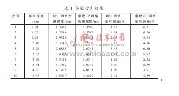 本文采用MATLAB軟件進行仿真實驗,通過提供的40組人工裂縫的樣本,對RBF神經(jīng)網(wǎng)絡(luò)系統(tǒng)進行訓(xùn)練學(xué)習(xí)和模式識別,并在學(xué)習(xí)初期對輸入數(shù)據(jù)進行了預(yù)處理,通過樣本訓(xùn)練逐漸生成最佳的RBF期網(wǎng)絡(luò)[8]。另取10組測試樣本數(shù)據(jù)作為輸入,用MATLAB軟件進行模擬仿真,同時利用RBF神經(jīng)網(wǎng)絡(luò)對其進行深度評估,并與常規(guī)BP神經(jīng)網(wǎng)絡(luò)進行對比,其實驗仿真結(jié)果如表1所示。
