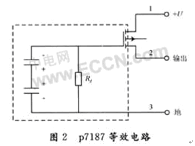 常見的熱釋電傳感器有p2613,p3782,p7187等。根據(jù)法拉第法則,人體的體溫約為3 7℃,輻射最多紅外線的波長是10μm左右,而p7187對(duì)7~20μm范圍波長比較靈敏,他采用了2個(gè)熱釋電元件PZT板,PZT板表面吸收紅外線,并在受光面的內(nèi)外各自安裝取出電荷的一對(duì)電極,能敏感的捕捉到被測物體或光源,具有很高的靈敏度。這2個(gè)受光電極反向串聯(lián),可有效地防止背景波動(dòng)以及干擾光照射時(shí)的誤動(dòng)作(一是環(huán)境變化引起的誤動(dòng)作,二是使用光調(diào)制器時(shí)的誤動(dòng)作)對(duì)傳感器的影響,當(dāng)2個(gè)受光電極同時(shí)受到紅外線照射時(shí),輸出電壓相互抵消而無輸出,只有當(dāng)人體移動(dòng)時(shí)才有電壓的輸出,輸出電壓比較精確的反映了人體移動(dòng)的情況。P7187等效電路如圖2[2]。