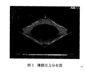 利用有限元分析軟件ANSYS對接觸式結(jié)構(gòu)的薄膜工作狀態(tài)進行了模擬。材料為Si,膜的形狀為正方形,邊長1000 μm,膜厚5 μm,極板間距10 μm。在1.01×105Pa的大氣壓力下,薄膜中央接觸部分及四個邊角基本不受應(yīng)力,四邊中央應(yīng)力最大為1.07 MPa,小于硅的屈服應(yīng)力7 MPa,其應(yīng)力分布如圖2所示。