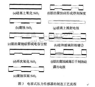 整個制造流程都采用標準工藝,如圖3所示。先熱氧化100 nm的SiO2,既作為腐蝕Si的掩膜,又作為電容兩電極的絕緣層。利用各向異性腐蝕形成電容空腔和將來露電極的??滩?,如果硅片厚度一致且KOH腐蝕速率均勻,此法可以在相當程度上等效于自停止腐蝕。從玻璃上引出電容兩電極,然后和硅片進行陽極鍵合。鍵合片利用KOH腐蝕減薄后反應(yīng)離子深刻蝕露出測量電極。