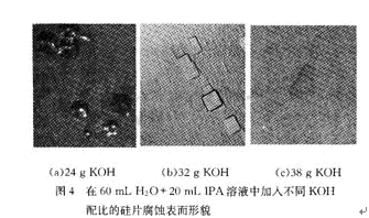 四棱錐和四棱臺的四個斜面對應(yīng)于腐蝕速率最低的(111)系列晶面。當濃度較低時,(100)和(111)晶面的腐蝕速率比小,所以出現(xiàn)小丘;當濃度增大時,(100)和(111)晶面的腐蝕速率比增大,所以出現(xiàn)小坑;濃度達到一定程度后,(100)和(111)晶面的腐蝕速率比趨于穩(wěn)定,依然出坑,而(110)和(111)晶面的腐蝕速率比增大,從而產(chǎn)生斜坡。只有調(diào)整KOH的濃度,得到匹配的(100)、(110)、(111)晶面的腐蝕速率,才能獲得較好的腐蝕表面。試驗還表明,溫度主要影響腐蝕速率,對硅片腐蝕形貌影響不大。