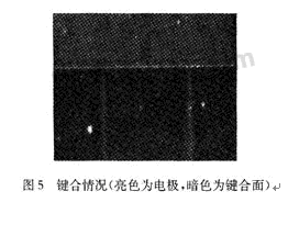 目前真空腔的形成多采用Si—Si鍵合或者陽極鍵合。本方案采用陽極鍵合,是因為陽極鍵合比Si—Si鍵合的要求低。首先溫度只需要400~500℃,其次表面光潔度要求也相對較低。本工藝過程中存在金屬電極,不適于用高溫;鍵合面存在高約1400 nm,寬為20μm的電極引線,鍵合面的SiO2經(jīng)過一定程度的KOH各向異性腐蝕后粗糙度為100nm左右,經(jīng)過試驗證明,鍵合情況良好(圖5),并具有良好的密封效果。